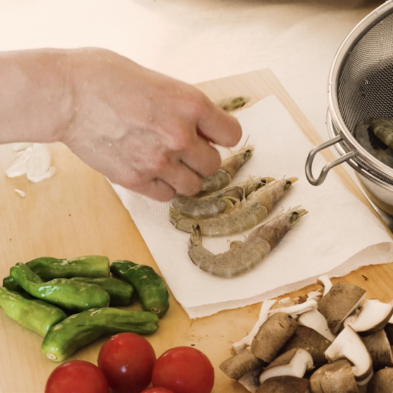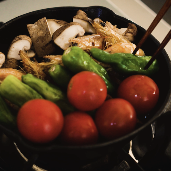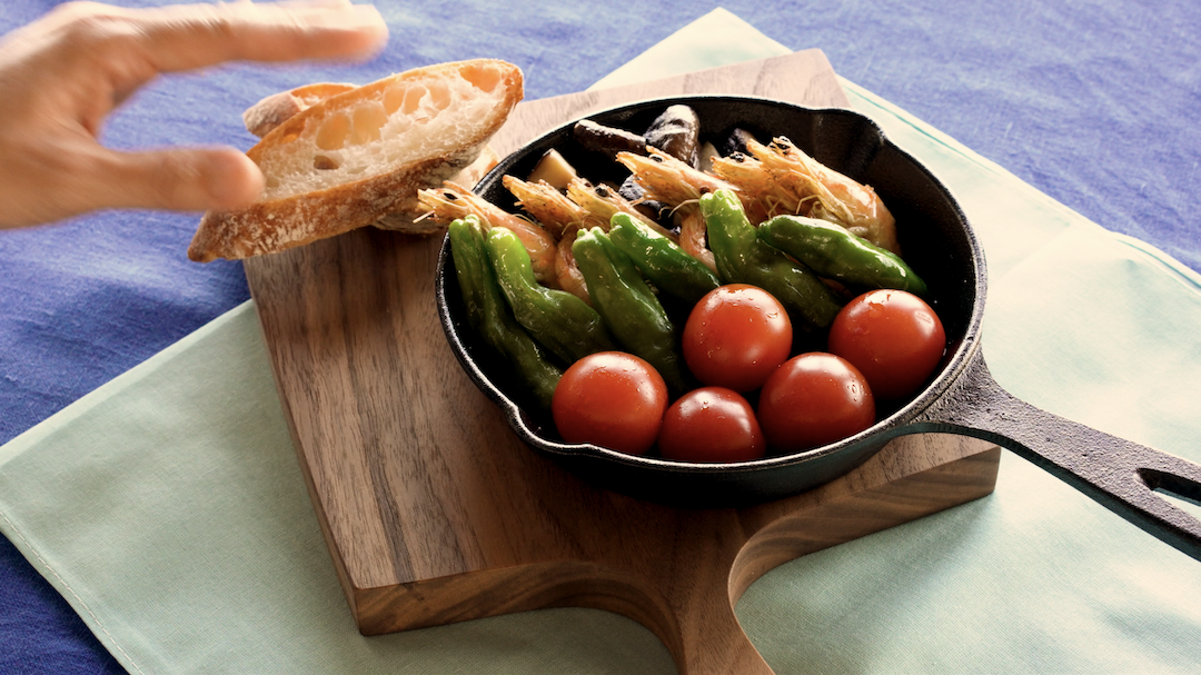 ③真海老の色が変わったら手前に寄せ、奥からしいたけ、ししとう、プチトマトの順に並べる。油が絡むよう返しながら3分ほど炒める。途中、オイルがなくなってきた場合は、少量ずつ足す。