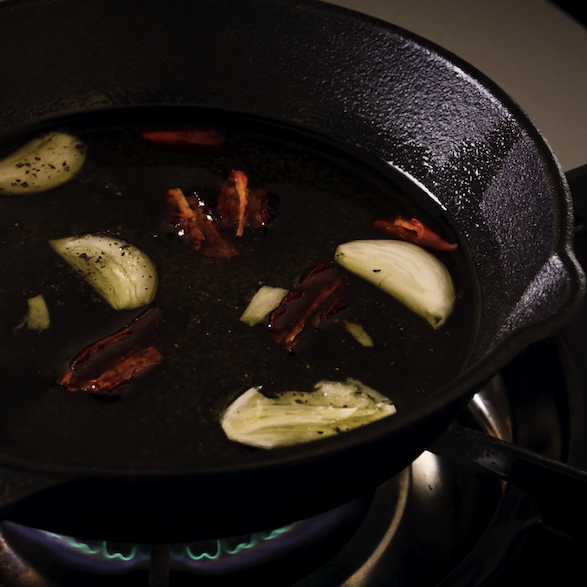 ①スキレットに唐辛子とにんにくを入れ、オリーブオイルを注ぎ、塩を加える。弱火にかけ、1〜2分ほど熱する。
