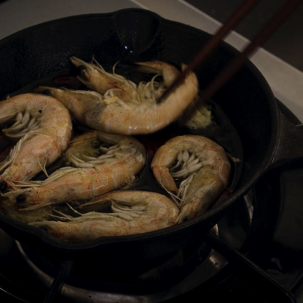 ②香りが立ってきたら中火にし、真海老を加える。ときどき返しながら、3〜4分ほど焼く。