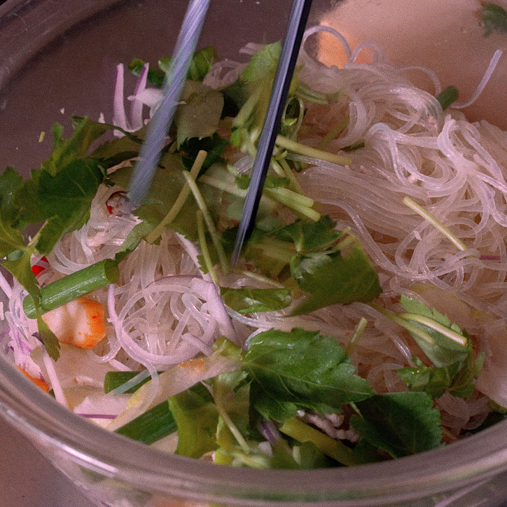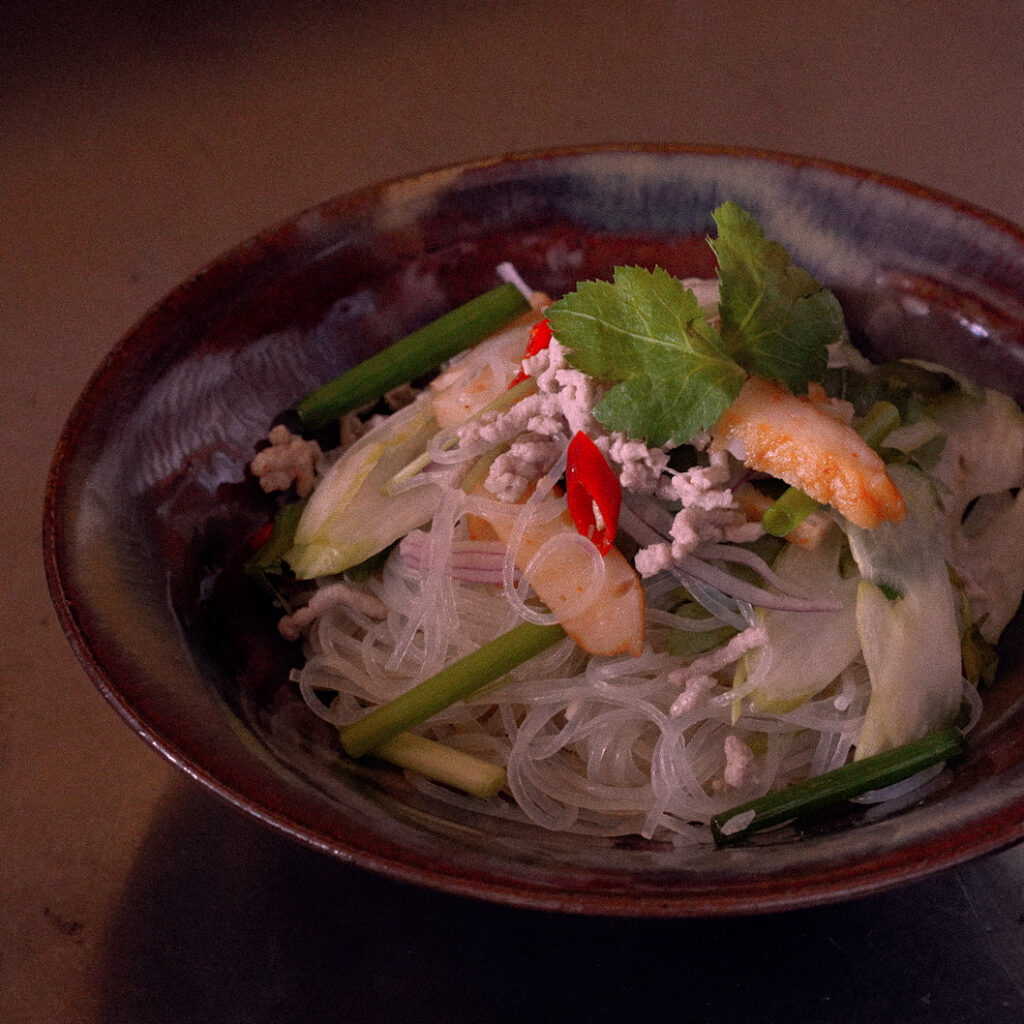 ③鍋にたっぷりの湯を沸かし、春雨・豚ひき肉を順に加え3-4分ほど茹でる。ざるにあげ、水気をしっかり切ったら①に加えてよく混ぜる。