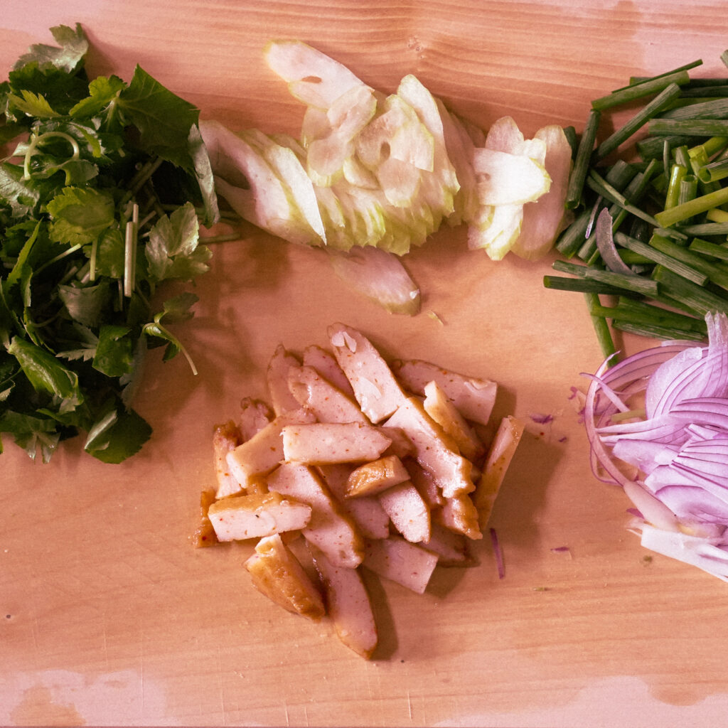 ②セロリは斜め薄切り、万能ねぎは長さ4cm、紫玉ねぎは薄切りにする。三つ葉は飾り用を取り分け、残りを4cmに切る。丸天ぷらは縦半分に切り、横に薄切りにする。
